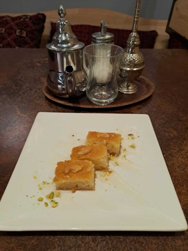 Gâteau de semoule, fleur d’oranger, amandes, sirop au miel maison